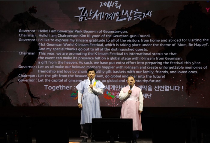 박범인 금산군수는 “올해 세계축제로 열리는 제41회 금산세계인삼축제를 기해 금산이 ‘세계인삼수도’임을 선포하게 되어 기쁘게 생각한다”며 “앞으로 인삼산업 발전을 위해 최선을 다하겠다”고 밝혔다.