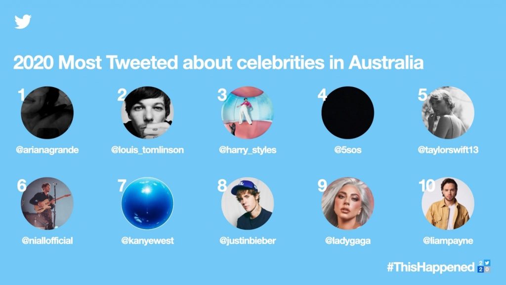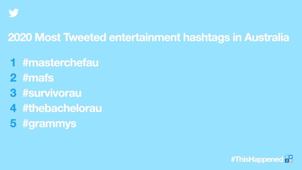MasterChef는 원래 인기가 있었지만 코로나19로 집에서 요리할 시간이 많아지면서 2020년 가장 많이 트윗된 예능 해시태그가 됐다. 호주판 ‘우리 결혼했어요’인 ‘Married At First Sight’ 해시태그 #mafs가 두번째로, 호주판 ‘정글의 법칙’이라 할 수 있는 생존 리얼 예능 ‘Australian Survivor’ #survivoraus가 세번째로 많이 트윗됐다. 그러나 호주에서 가장 많이 트윗된 유명인은 음악인으로 올해 대부분 새 싱글을 내놓은 가수들이다. 원다이렉션 멤버 중에서는 제인 말릭을 제외한 모두 멤버가 순위에 올랐다.