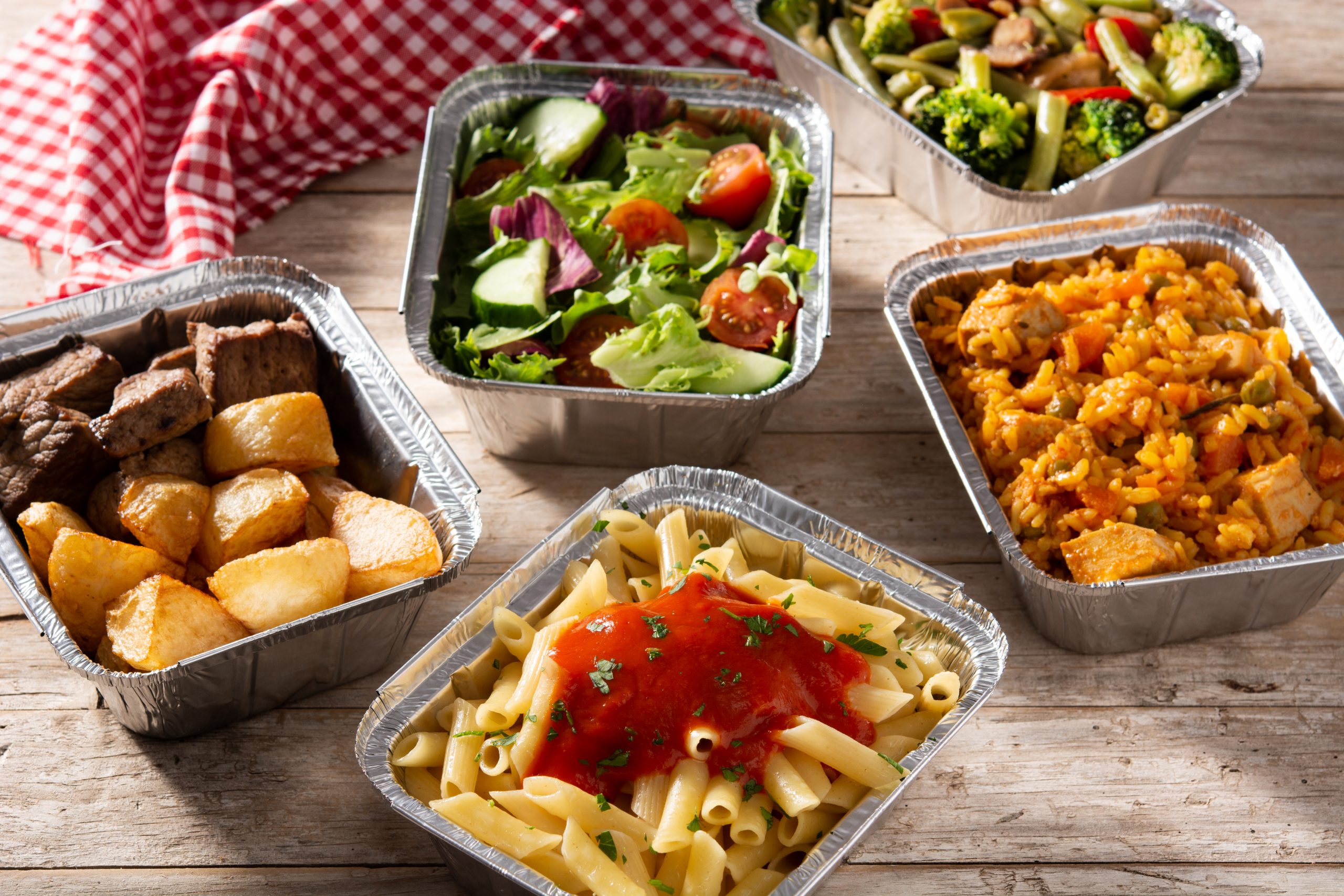Take away healthy food in foil boxes on wooden table