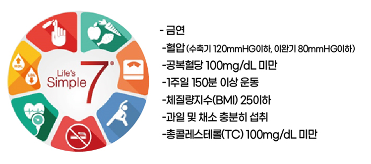 이 7가지 생활방식은 많은 연구들을 통해 심장질환이나 뇌졸중을 예방하는 것으로 확인된 방법들로, 금연, BMI(체질량지수)를 25이하로 유지하고, 매주 150분 이상 중등도의 운동을 하며, 과일과 채소를 충분히 섭취하고, 수축기혈압(120mmHG)과 이완기혈압(80mmHG)이하로 유지하고, 공복혈당 100mg/dL이하, 마지막으로 총콜레스테롤을 200mg/dL이하로 유지하는 것이다.