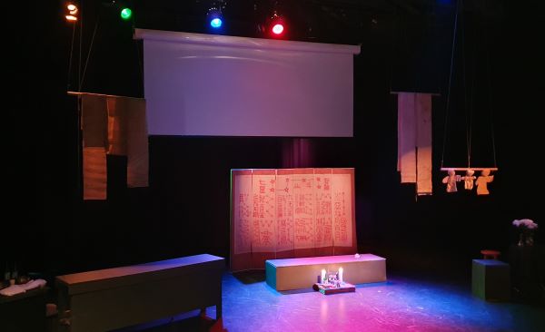공연장으로 들어가니 무대가 보였다. 가운데에 병풍과 관이 놓였고 왼쪽에 염을 하는 탁자, 오른쪽에 작은 의자와 아버지, 어머니, 아기로 보이는 헝겊 인형 셋이 허공에 걸려 있었다. 요요히 빛나는 조명 아래 시신을 염하는 장소를 재현한 무대는 숙연함을 자아냈다. 앞으로 저 공간에서 삶과 죽음은 어떤 모양으로 드러날까? 무대 장치마다 어찌할 수 없는 죽음 앞에서 안간힘을 쓰는 가련함이 배여 있는 듯했다.