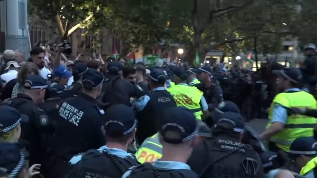 시드니 중심업무지구(CBD)에서는 팔레스타인 행동 그룹(Palestinian Action Group) 소속 시위대 수천 명과 NSW 경찰이 충돌했다. 당시 인근 시드니 국제컨벤션센터(International Convention Centre)에서는 허초그 대통령이 시드니 유대인 커뮤니티 수천 명을 대상으로 연설 중이었다.