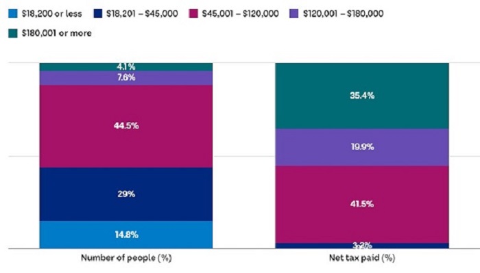 2020-21년 세금 신고서를 제출한 대부분의 호주인은 4만5,000달러에서 12만 달러 사이의 과세 등급(tax bracket)에 포함돼 전체 개인소득세의 41.5%를 납부했다.