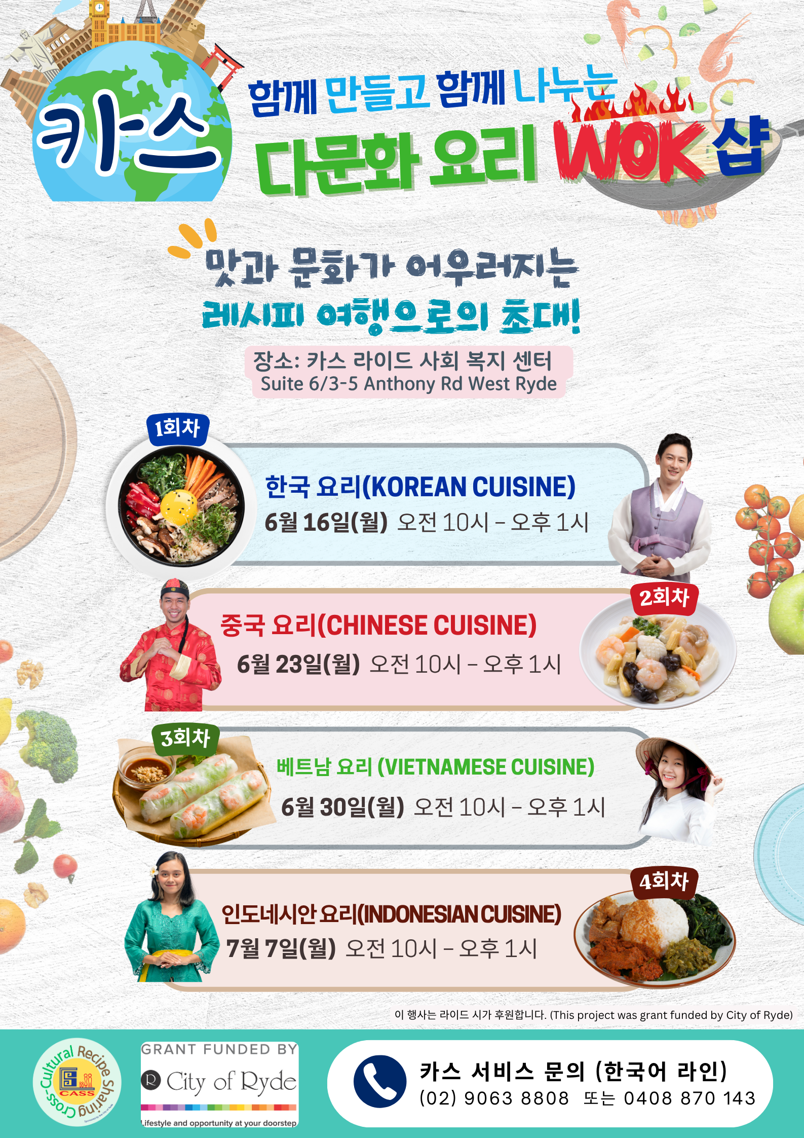 다문화 사회복지 기관 카스(CASS)가 주관하고 라이드 시가 후원한 ‘카스 다문화 레시피 쉐어링(Tasty Journey: Cross-Cultural Recipe Sharing Workshop)’ 4주 프로젝트의 첫 번째 프로그램인 한국 요리편이 지난 6월 16일(월) 웨스트 라이드 ILMI 식당에서 성황리에 열렸다.