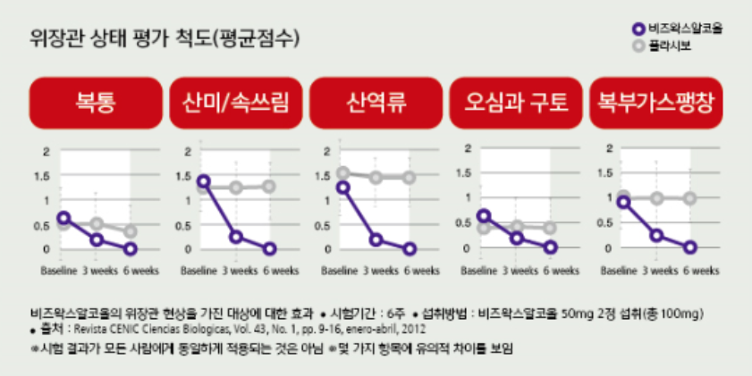 6주간의 비즈왁스알코올 인체적용시험 결과, 복통·속쓰림·위산역류·오심·구토·복부가스팽창 등의 위장관 증상이 70%이상 개선을 확인했다.