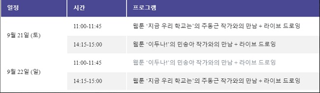 이틀간 진행 예정인 ‘작가와의 대화’ 및 ‘라이브 드로잉쇼’에서는 주동근 작가와 민송아 작가가 자신의 창작 과정과 작품 세계에 대해서도 설명한다.
