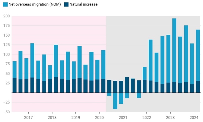 전염병 사태가 시작된 2020년 초까지, 봉쇄 이전 4년 동안의 호주 인구는 매 분기별로 평균 약 9만 7,500명씩 증가했다. 그리고 봉쇄 조치 이후 4년 동안 인구 증가는 분기당 약 9만 4,700명이었다. 지난 4년 동안의 인구 증가는 팬데믹 사태 이전 4년 동안에 비해 약간 적었던 것이다.