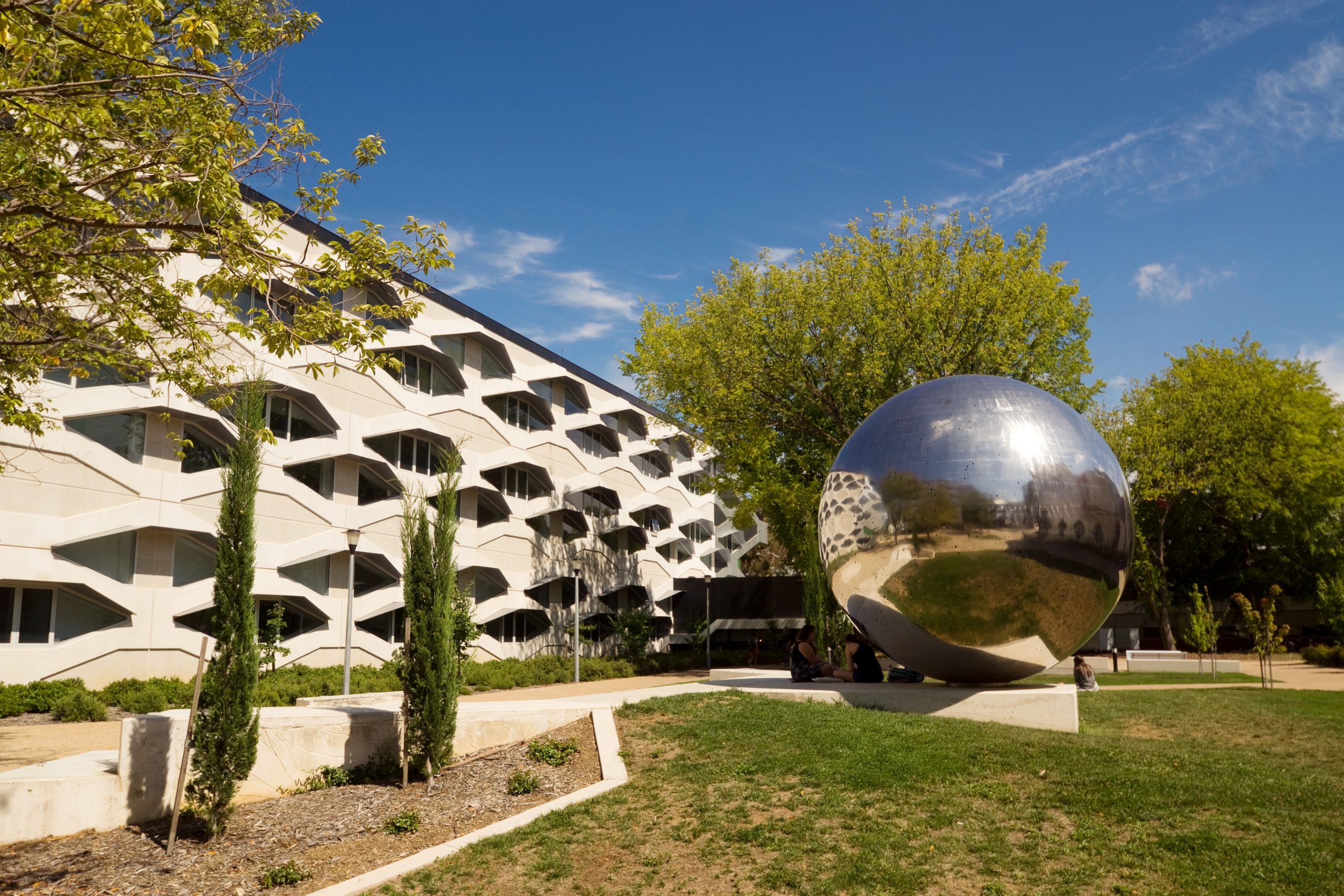 Canberra, Australia - March 14, 2014: A large silver sphere, entitled UNA, is seen before the Linnaeus Building (housing the Research School of Biology) at the Australian National University.