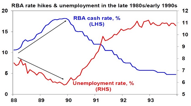 그는 “(금리 상승에 따른) 상환액 인상액이 대출자들에게 영향을 미치고, 이들이 가계 지출을 조정하고, 나아가 기업과 일자리가 영향을 받기까지 시간이 걸린다”며 “1988년과 1989년 사이 현금 금리가 10.5%에서 18%로 인상되었지만 실업률이 계속 하락했던 1980년대 후반의 호주 상황이 결국 1990년 들어서 경기 침체를 불러왔던 것은 이를 보여주는 대표적인 사례”라고 설명했다. 여기에다 올리버 박사는 “당시 금리는 더 높았지만 소득대비 가계부채는 현재의 3분의 1 수준”이라는 점도 덧붙였다.
