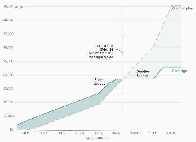 현재 정부가 내놓은 변경안을 보면, 과세소득 14만6,484달러 미만의 모든 근로자는 본래 계획보다 더 많은 세금감면 혜택을 받게 되며, 그 이상의 고소득자에게는 기존 납세 시스템과 비교해 훨씬 적은 감세가 제공된다.